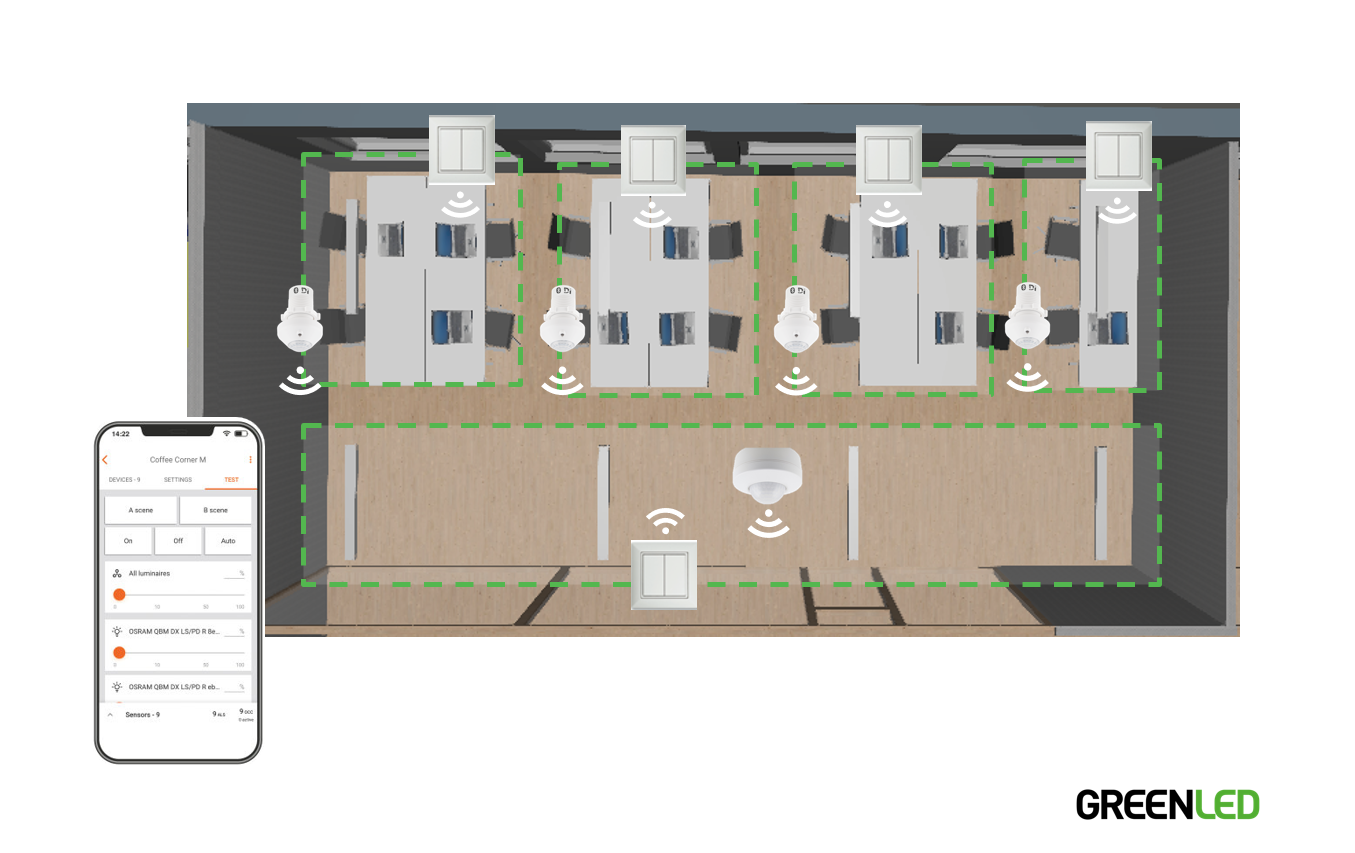 LED-ajurit, anturit ja älykkäät painikkeet on helppo konfiguroida Bluetooth mesh -teknologialla – valitse valmis valoprofiili tai luo oma eri tilatyyppeihin
